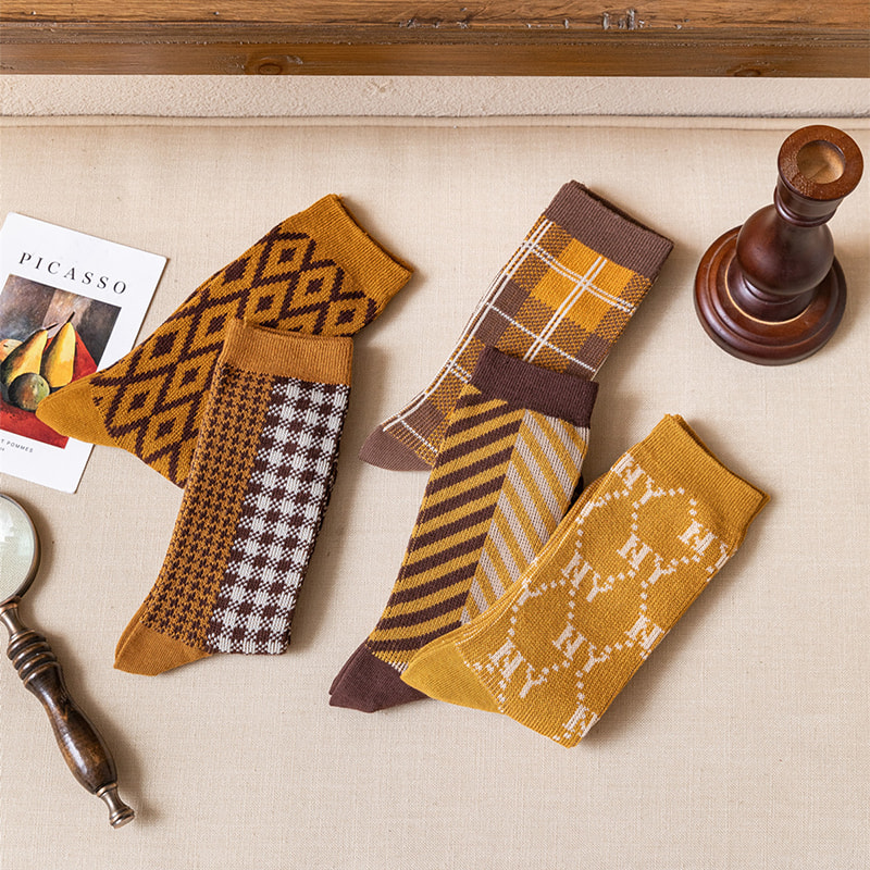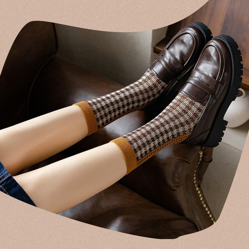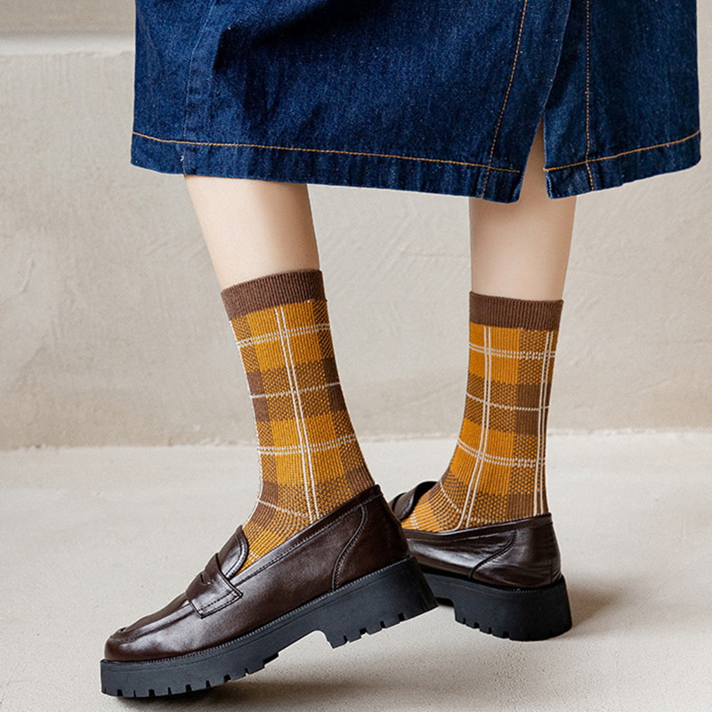 Thuis / Product / Dames sokken / Women's Mid Tube Socks / Geruite luipaardprint dubbele track Italiaanse retro dubbele naaldpaalsokken